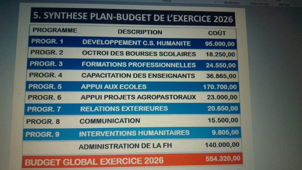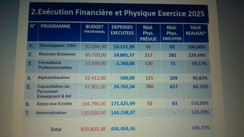 Ces assises ont été organisées pour faire le point sur le rapport annuel de l’exercice 2025 avec un budget prévisionnel de 419 823,30 dollars, les dépenses exécutées de 446 404,46 dollars avec un taux de réalisation chiffré à 106,33% et ensuite présenter le plan budget 2026 chiffré à 554 320 dollars ( dont 20% déjà mobilisés) voté à l’unanimité par ples membres présents dans la salle après la lecture du procès verbal.