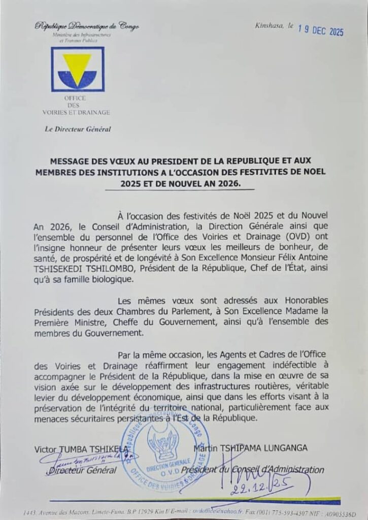 À l’occasion des festivités de Noël 2025 et du Nouvel : Le Conseil d’Administration, la Direction Générale ainsi que l’ensemble du personnel de l’Office des Voiries et Drainage (OVD) réaffirment leur engagement indéfectible à accompagner le Président de la République, Félix Tshisekedi, dans la mise en œuvre de sa vision axée sur le développement des infrastructures routières, véritable levier du développement économique (Message de voeux 2025)