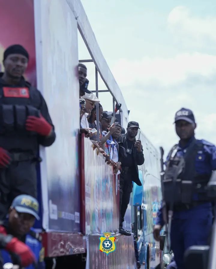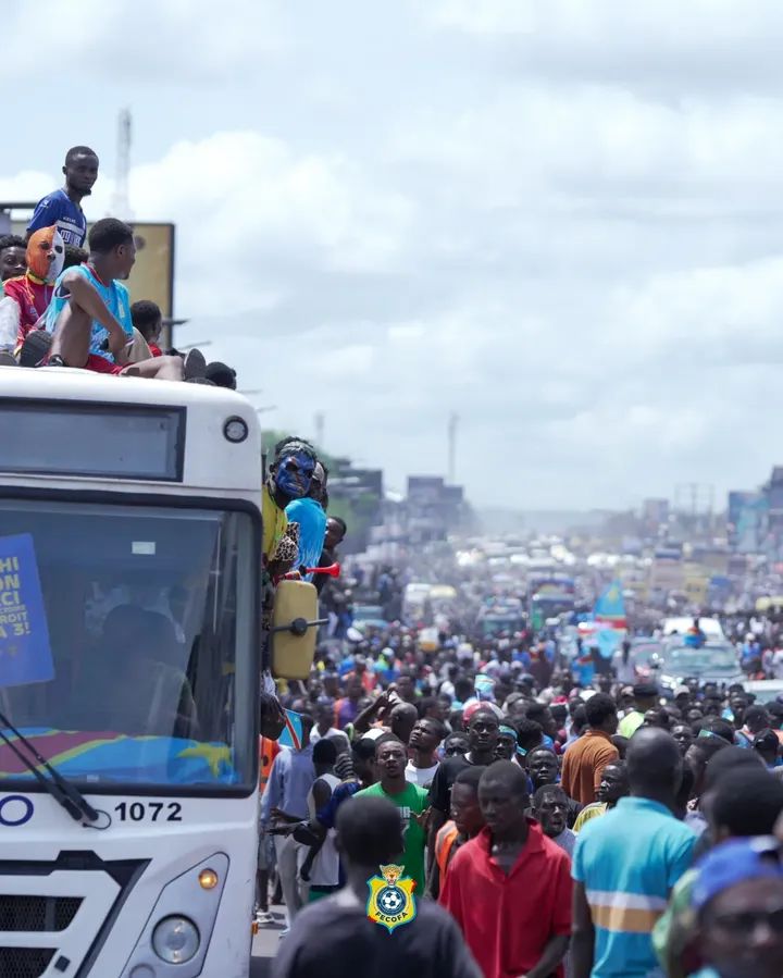 À l’aéroport international de N’djili, des milliers de supporters, drapés de drapeaux bleu, rouge et jaune, se sont massés pendant des heures. Chants, sifflets, tam-tams et vuvuzelas ont résonné dans une ambiance indescriptible.