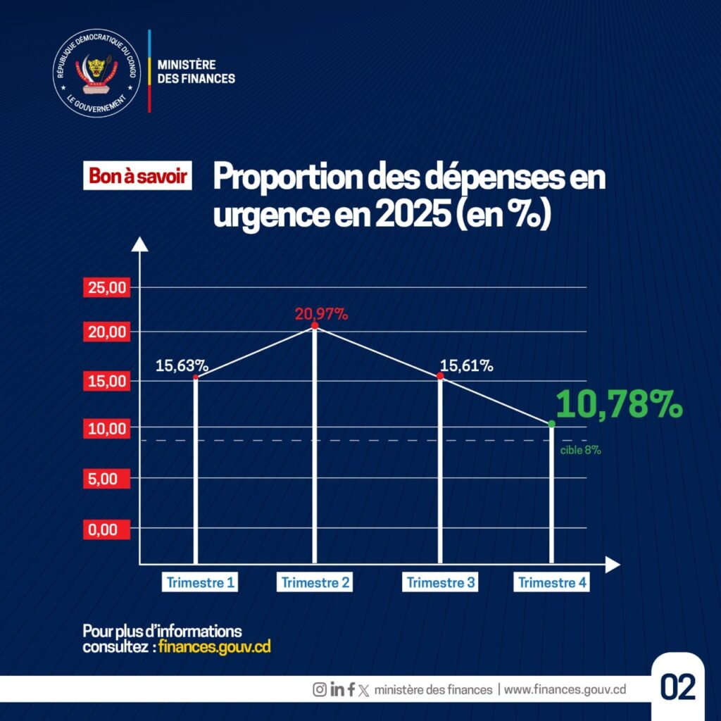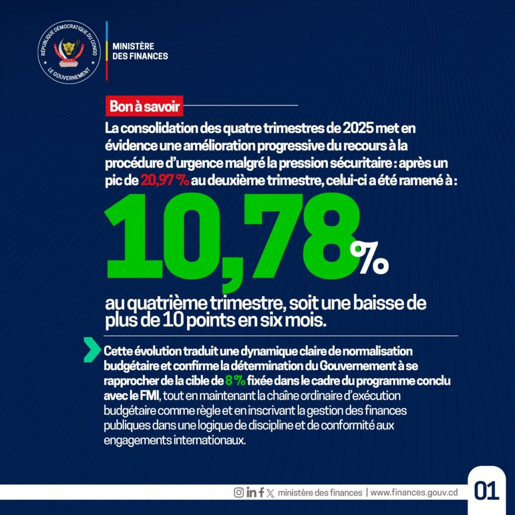 En dépit d’un environnement sécuritaire exigeant, la République démocratique du Congo poursuit résolument la consolidation de sa discipline budgétaire. La lecture consolidée des quatre trimestres de l’exercice 2025 révèle une amélioration progressive et structurée du recours à la procédure d’urgence, traduisant les efforts soutenus du Gouvernement, sous la coordination du Ministre des Finances, Doudou Fwamba.
