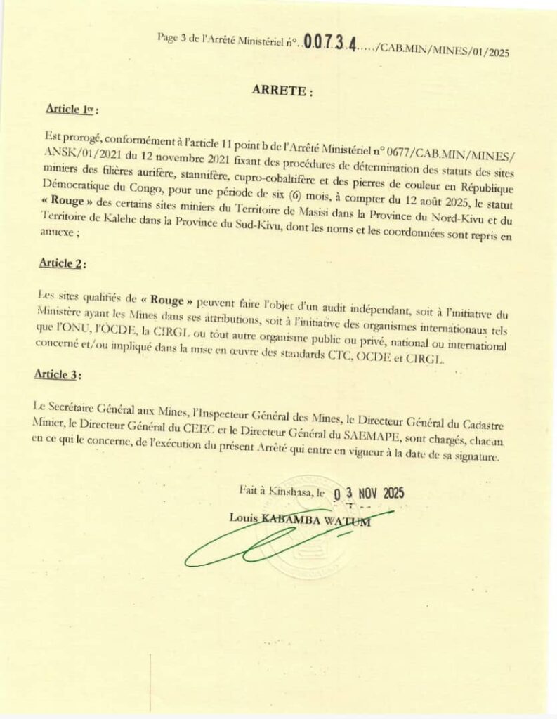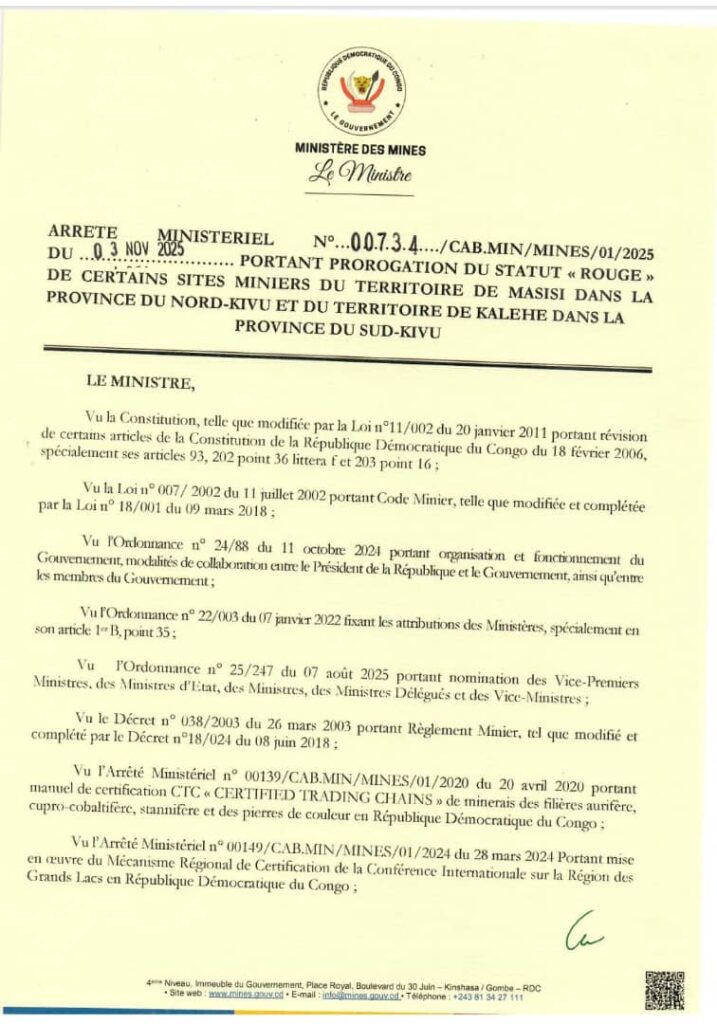 Le Ministre des Mines, Louis Watum Kabamba, a signé un arrêté portant prorogation pour une période de six mois du statut rouge de certains sites miniers du territoire de Masisi, dans la province du Nord-Kivu, et du territoire de Kalehe, dans la province du Sud-Kivu. Et c’est conformément à l’Arrêté Ministériel n° 0677 du 12 novembre 2021 fixant des procédures de détermination des statuts des sites miniers des filières aurifère, stannifère, cupro-cobaltifère et des pierres de couleur en RDC. Signé le 03 novembre dernier, ledit Arrêté a été officiellement rendu public le vendredi 14 novembre 2025.